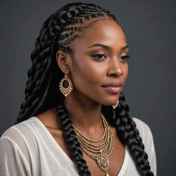 The woman stands with a graceful poise, her ebony skin glowing with a natural radiance. Her braided hair cascades elegantly, each braid meticulously woven to create a beautiful, textured pattern. She wears a stunning necklace that rests gently around her neck, complementing her graceful neckline. Her earrings, bold yet refined, frame her face, adding a touch of sophistication. The overall look is one of elegance and confidence, with her accessories enhancing her beauty and the intricate braids highlighting her distinct style.