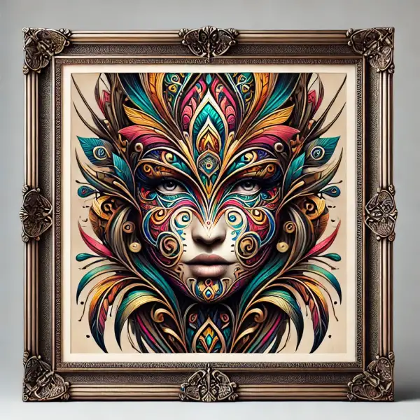 A framed lady face painting is an artistic portrayal capturing the essence of femininity through a painted female face, beautifully showcased within a decorative frame.