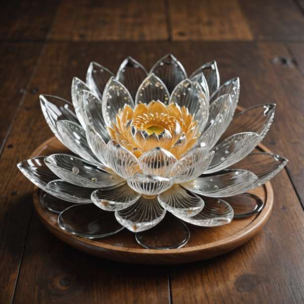 A glass decor shaped like a lotus rests on a surface, its petals arranged in careful layers that rise with gentle symmetry. The smooth glass catches light, creating delicate reflections that highlight the form without overwhelming it. Each petal seems distinct yet connected, giving the piece a sense of harmony and balance. Placed simply, it stands as both ornament and centerpiece, drawing attention through quiet elegance. The lotus shape, clear and refined, conveys stillness and grace, a crafted design that holds presence without the need for embellishment.