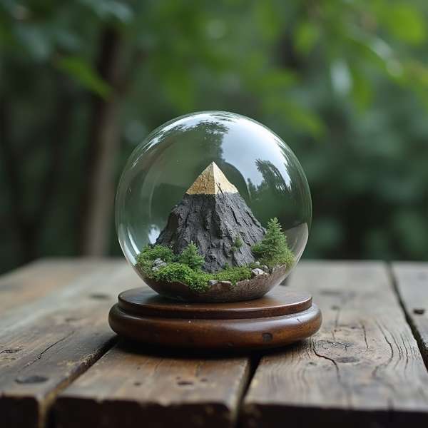 A glass orb rests neatly on a surface, smooth and refined in its form. Within, a miniature mountain is captured, rising in detailed contours that resemble a landscape preserved in tiny scale. The orb enhances the scene, magnifying certain angles while softening others, creating an impression of depth and distance. Light reflects gently off the glass, giving the mountain an almost timeless presence. The simplicity of the surrounding space allows the orb to stand out, inviting quiet observation of its carefully crafted, enclosed world.