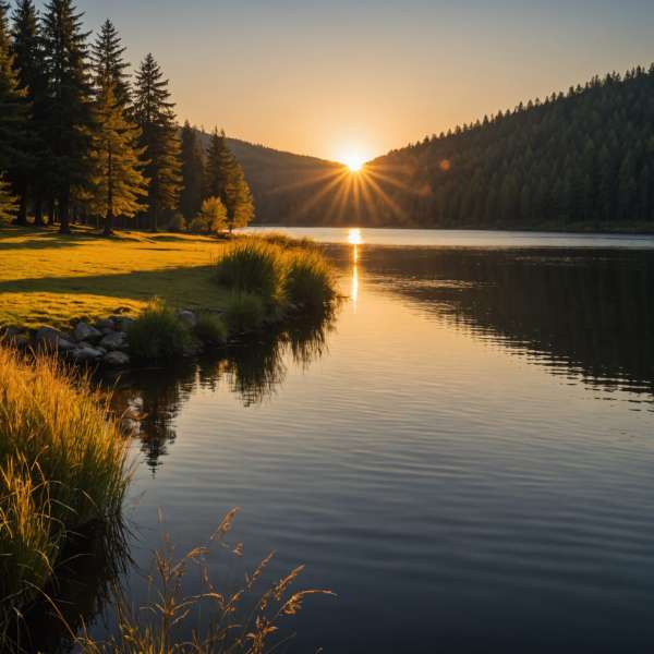 Tall trees line the edges of a gently flowing river, their reflections mirrored in the calm water. The scene stretches toward the horizon, where the sun begins to set, casting a soft glow across the landscape. The sky above is clear, vast, and open, enhancing the sense of tranquility and space. Leaves rustle lightly in the evening breeze, and the river moves steadily, adding a gentle rhythm to the scene. The combination of water, trees, and fading sunlight creates a serene, peaceful atmosphere, capturing the quiet beauty of nature at dusk.